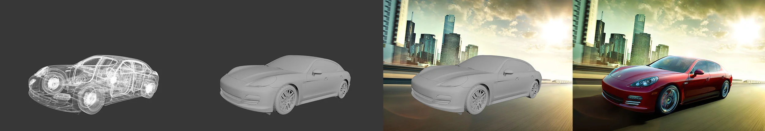 We combined this Porsche Panamera data with a supplied photographic background and added lighting and motion effects.